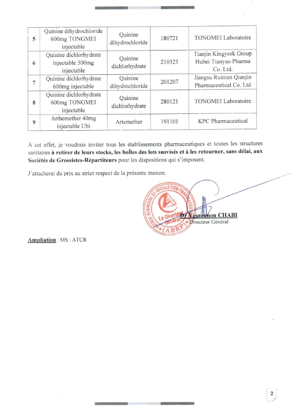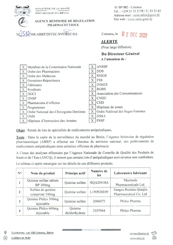 RAPPEL DE LOT SPECIALITES ANTIPALUDIQUES