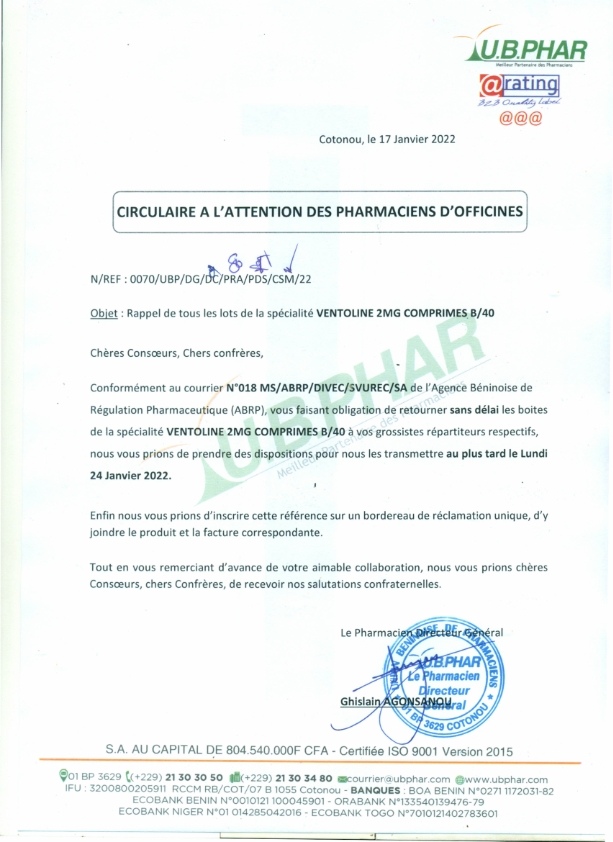RAPPEL DE LOT VENTOLINE 2MG COMPRIME B/40